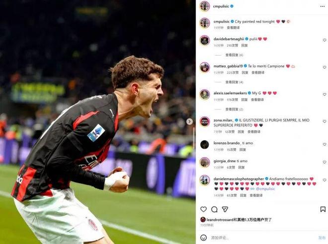 在本轮意甲米兰德比中,米兰1-0国米。本场比赛普利西奇打进全场唯一进球,赛后他也在社媒晒出庆祝照片,配文写道:“今晚米兰城涂上一抹红色!”